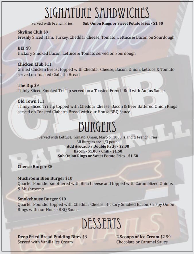 Skyline Club offers a diverse menu that suits various tastes. Signature sandwiches and juicy burgers dominate the offerings. The Mushroom Bleu Burger and Chicken Club delight many. For lighter bites, guests enjoy small shareable portions. Those with a sweet tooth can indulge in Deep Fried Bread Pudding Bites or ice cream. Cocktail selections are plentiful, catering to different preferences. Happy hour brings exciting options on food and drinks. The straightforward, traditional cuisine provides a comforting dining experience.